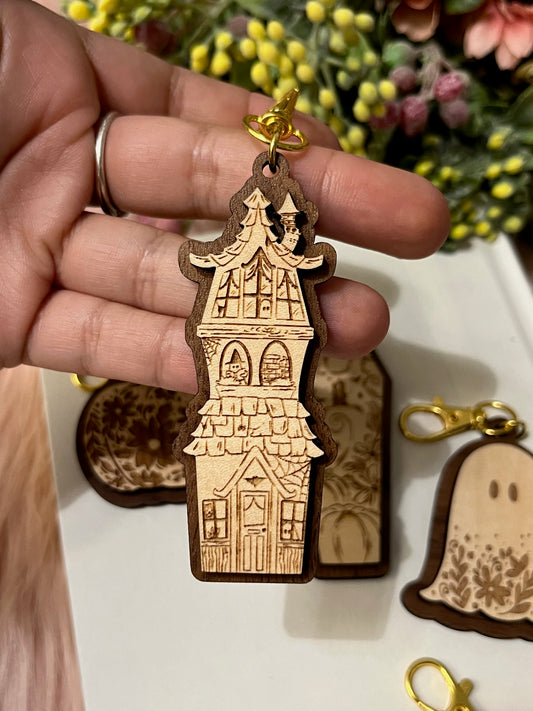 Spooky Ghost House Wood Keychain