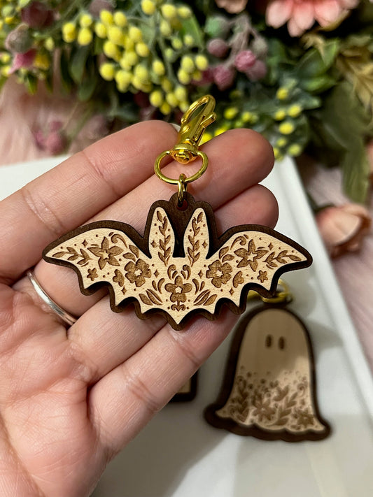 Floral Bat Wood Keychain