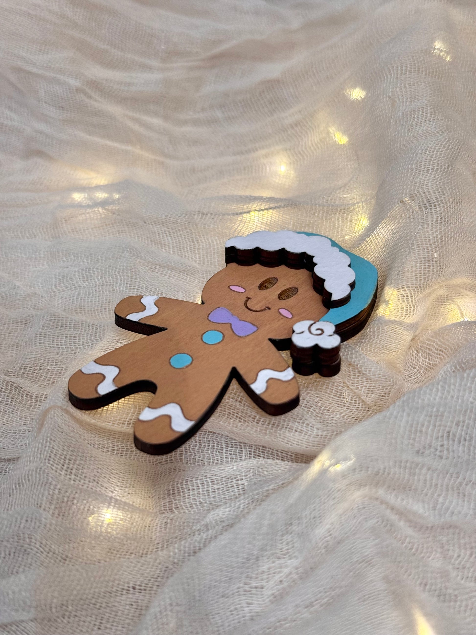 This fun wood pin shows a gingerbread wearing a jolly Christmas hat. Pin it to your jacket, bag, or sweater to add holiday cheer.