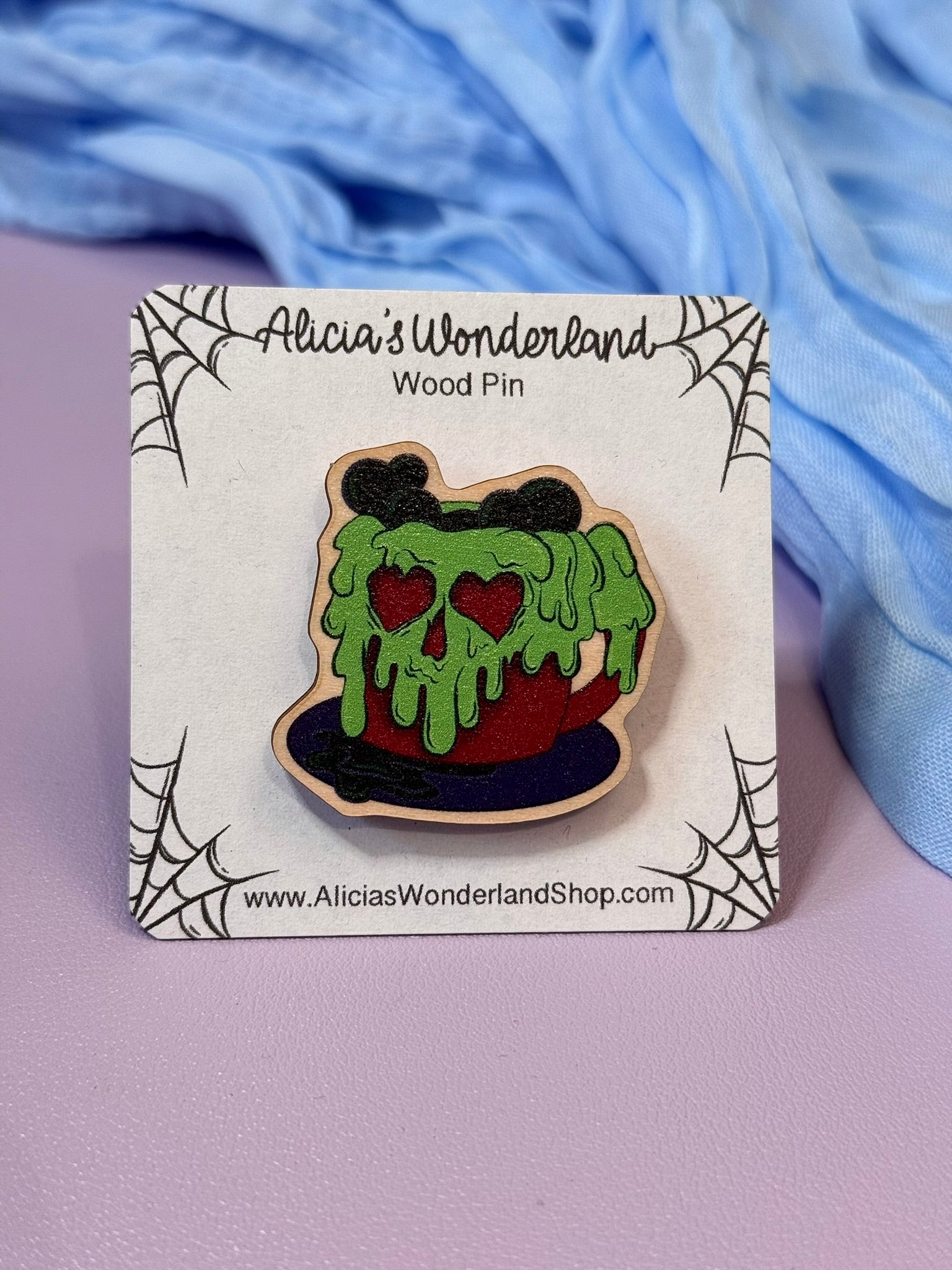 This wood pin features a fun mug design inspired by a favorite character. It's great for decorating backpacks, jackets, or pin boards. Small, lightweight, and easy to attach.