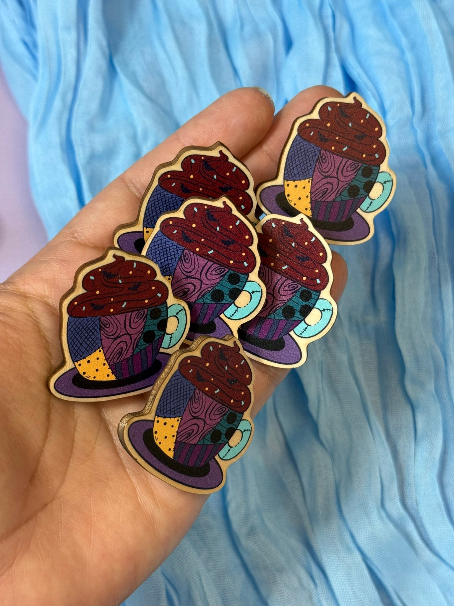 This wood pin features a fun mug design inspired by a favorite character. It's great for decorating backpacks, jackets, or pin boards. Small, lightweight, and easy to attach.