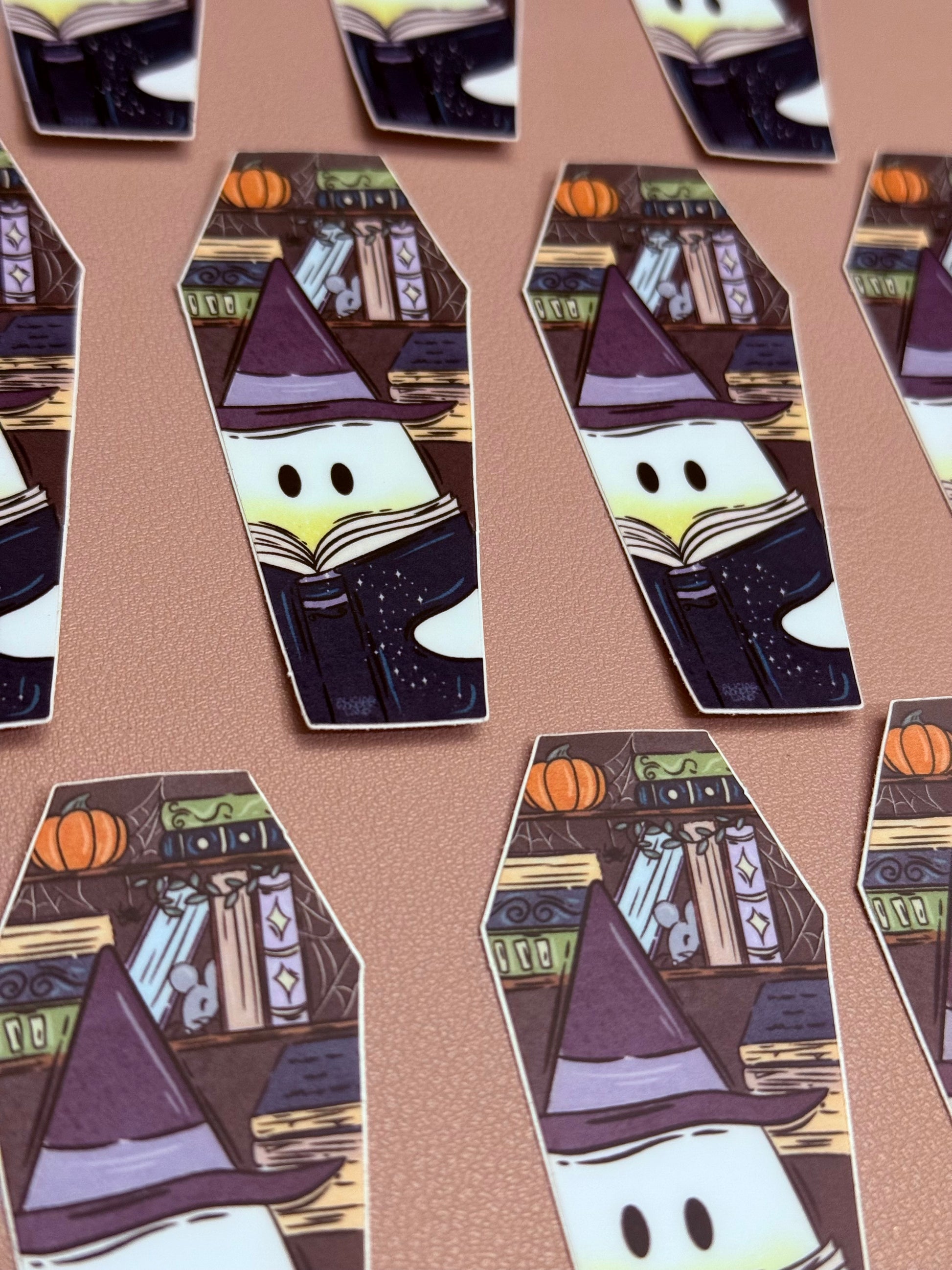 This adorable ghost has claimed the perfect nook in his haunted library, completely absorbed in his latest page turner. Perfect for your laptop, water bottle, or anywhere you'd like.