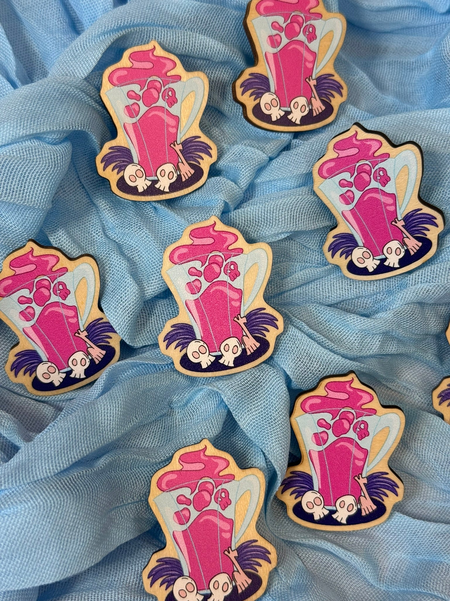 This wood pin features a fun mug design inspired by a favorite character. It's great for decorating backpacks, jackets, or pin boards. Small, lightweight, and easy to attach.